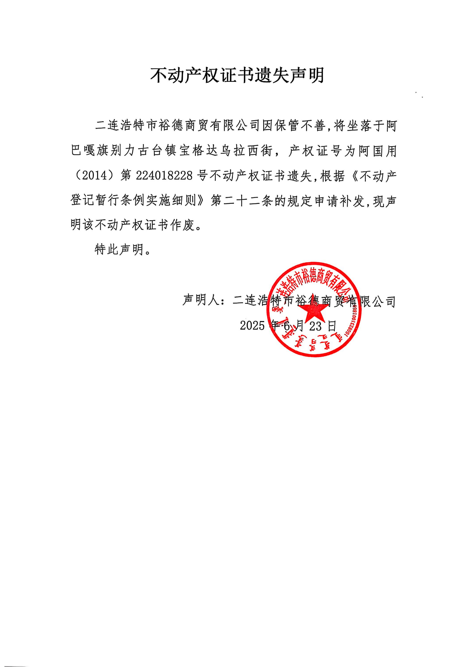 關于二連浩特市裕德商貿有限公司不動產證遺失的聲明