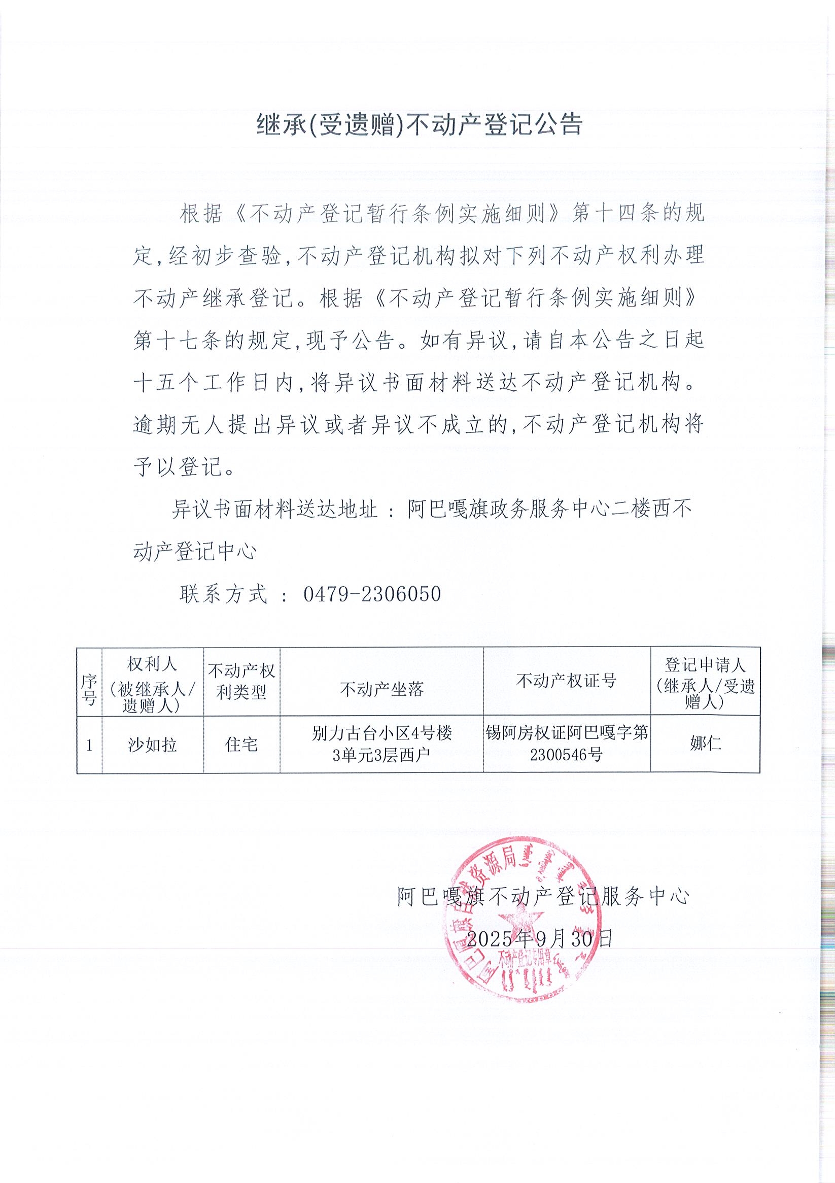 關(guān)于娜仁申請繼承沙如拉不動(dòng)產(chǎn)的公告